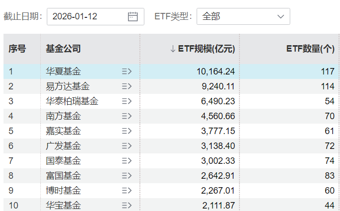 公募基金最新ETF总规模前10名(图源:Wind,数据截至2026.1.12)