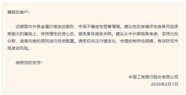 2月1日,中国工商银行股份有限公司发布“关于进一步做好贵金属市场风险防范的提示”。工行表示,近期国内外贵金属价格波动剧烈,市场不确定性显著增强。建议投资者在审慎评估自身风险承受能力的基础上,保持理性投资心态,避免盲目追涨杀跌。建议从中长期视角考虑,坚持分批分散、适度均衡的原则进行投资配置。请投资者密切关注行情变化,合理控制持仓规模,有效防范市场波动风险。